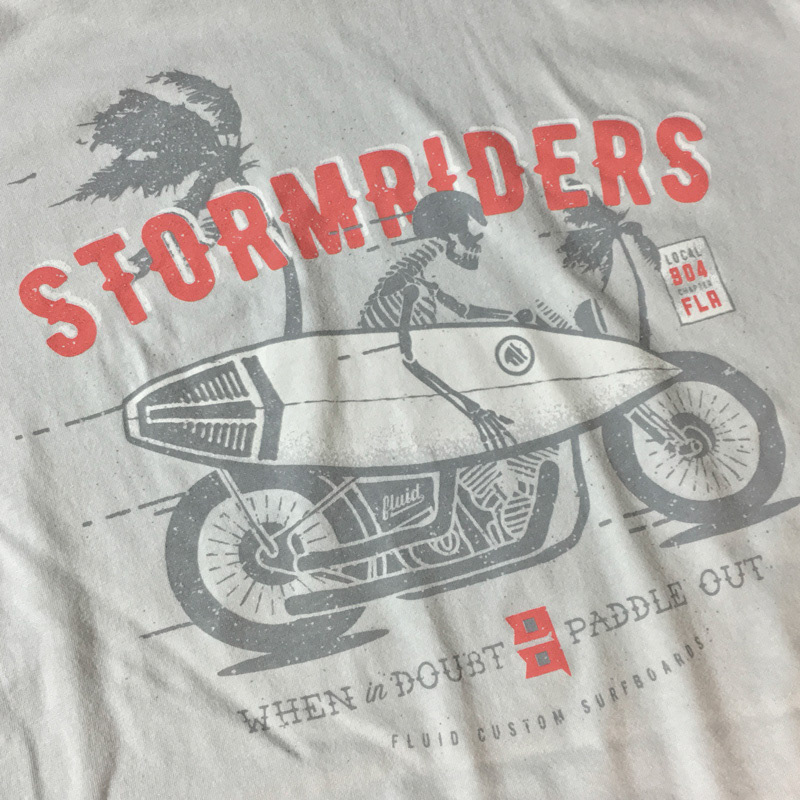 Fluid Surfboard's second "Storm Riders" tee is a 3-color water-based silkscreen on a 100% ring-spun cotton tee. All design, materials spec, and production coordination.